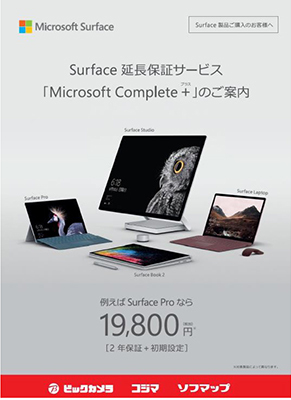 Microsoft Completeは、Surfaceとの同時購入によって1年間のメーカー保証と90日間の技術サポートという通常の保証・サポートに加えて、ハードウェア製品保証と技術サポートを1年間延長して受けられるサービス。2年間にわたって、「通常利用における故障」、不意の「水濡れ」、「落下」、「過充電」が保証される。Microsoft Complete+は、Microsoft Completeの延長保証内容に加えて、通常9000円相当のSurface初期設定サポートをセットにしたもの。