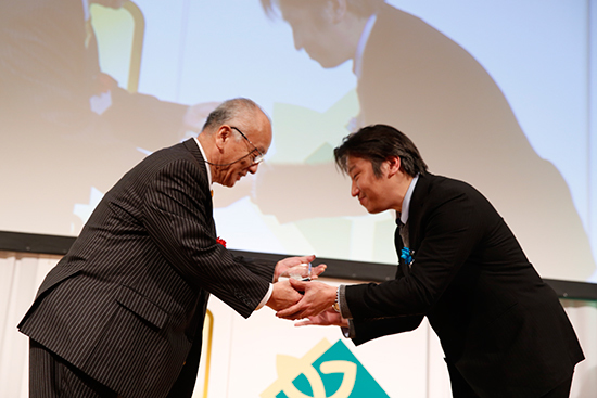 プレゼンターからトロフィーを受け取り、握手を交わす