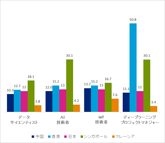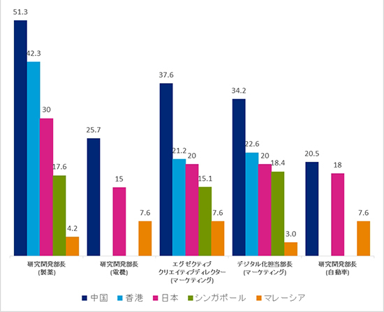 なお、為替は2018年1月24日のレートで、1人民元=17.1円、1HKドル=14.1円、1マレーシアリンギット=28.1円、1シンガポールドル=83.7円で計算。カントリーマネージャー(製薬)はボーナスを含まず、それ以外はすべてを含んでいる。調査によれば、ハイスキル人材の職務において、中国、香港、シンガポールの給与が日本を上回っている。他国と比べて日本が半額以下というケースもある。