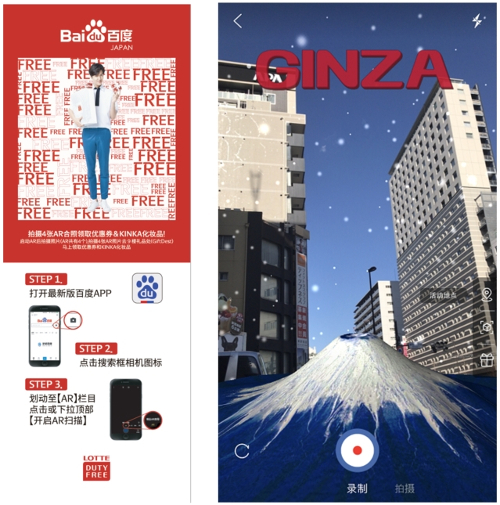 日本政府観光局によれば、2017年の訪日外客数は735万5800人と初めて700万人を超えた。しかも、2017年国慶節期間の訪日中国人客数は66万3815人と伸びており、今年2月の春節期間中も訪日中国人客数が前年を上回ることが予想されている。このような状況から、バイドゥは中国観光客向けにARでを活用してインパクトのあるPRを実施することに踏み切った。