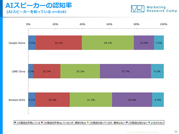 また、「所有している」「所有していないが、興味はある」とAIスピーカーを認知しているなかで、製品別の興味度の割合は「Google Home」が39.6%、「Amazon Echo」が30.7%、「LINE Clova」が23.8%という結果だった。