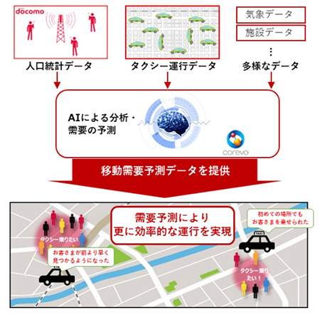 AIタクシーは、現時点から30分後までのタクシー乗車需要予測結果などのデータをオンラインで配信。タクシー運行データや気象データ、周辺施設データなどに加えて、NTTドコモの「モバイル空間統計」のリアルタイム版(人口統計データ)を活用し、日本各地の性別や年齢層など、属性ごとの人数分布の移動による変化をリアルタイムに把握しながら、各データを人工知能で分析することによって、乗車需要を10分ごとに予測する。広域で人数分布の移動による変化をリアルタイムに把握できる人口統計データと、AIを活用したタクシー乗車需要予測のサービスは、世界初となる。