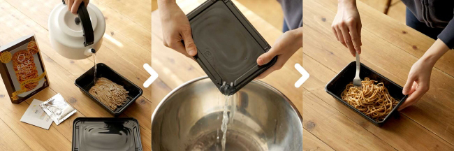 作り方は一般的な「カップ焼きそば」と同じ。お湯を入れて3分経ったら湯切りをし、付属のパスタソースを和える