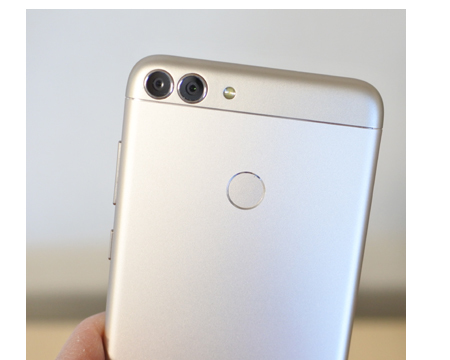 質感のあるゴールドのメタルボディ。背面には指紋認証センサーと2つのレンズが並ぶ