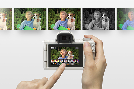 液晶モニターは3.0型のタッチパネルで、バリアングル液晶を採用。約236万画素の有機ELディスプレイ内蔵EVF(電子ビューファインダー)を備える。ダイヤルやボタンなどの操作部は右側に集約することで片手でもコントロールしやすいよう設計した。