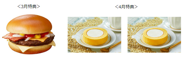 3月特典の「マクドナルド・グランベーコンチーズ」と、4月特典の「ローソン・プレミアムロールケール」