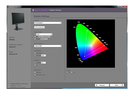 ソフトウェアは、製品ページから無料でダウンロードできる「Palette Master Element」を使うことで、ディスプレイを最適な状態に調整、維持することができる。対応するキャリブレーターが必要になるが、品質に統一性を持たせるため出荷時にキャリブレーションを施しており、購入時から正確な色を表示できるようになっている。