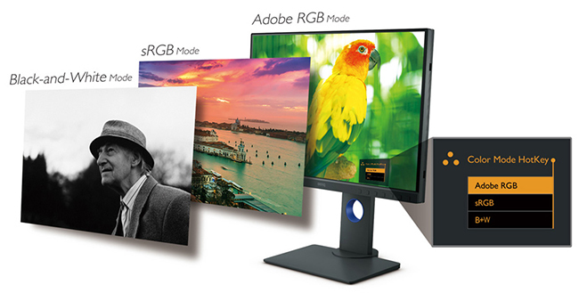 まず、カラーモード用ホットキーは、押すだけで3つのプリセットカラーモードを簡単に切り替えられるボタン。初期設定ではAdobe RGBとsRGB、モノクロが設定されているが、5秒間長押しすることで用途にあわせて好みのプリセットモードにカスタマイズできる。手軽な価格の製品であっても、上位機種に迫る使い勝手を備えるのは、ユーザーに配慮した進化だ。