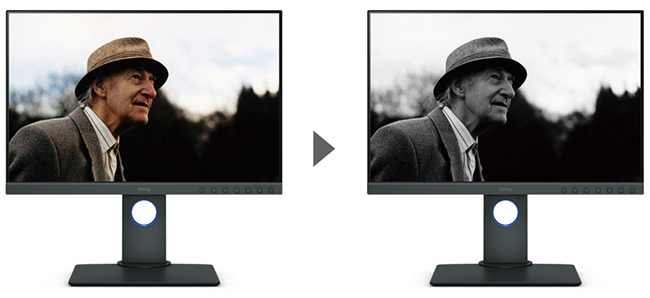 「SW240」には、写真家の作業を円滑に進めるために配慮した工夫が所々に散りばめられている。なかでも代表的な機能が2点ある。「カラーモード専用ホットキー」と「モノクロモード」だ。まず、カラーモード用ホットキーは、押すだけで3つのプリセットカラーモードを簡単に切り替えられるボタン。初期設定ではAdobe RGBとsRGB、モノクロが設定されているが、5秒間長押しすることで用途にあわせて好みのプリセットモードにカスタマイズできる。手軽な価格の製品であっても、上位機種に迫る使い勝手を備えるのは、ユーザーに配慮した進化だ。