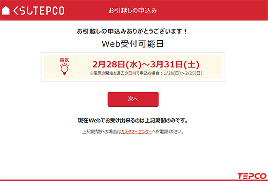 東電EPの「お引越しの申込み」サイトでは、通常は3営業日後に手続きが完了するところ、2月20日から4月30日のハイシーズンは2営業日で完了する。つまり、引っ越しをする2日前(土、日、祝日除く)までに手続きすれば、引っ越した当日から快適な生活を送ることができるというわけだ。