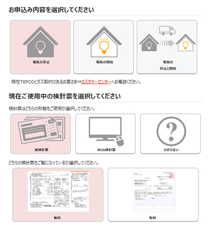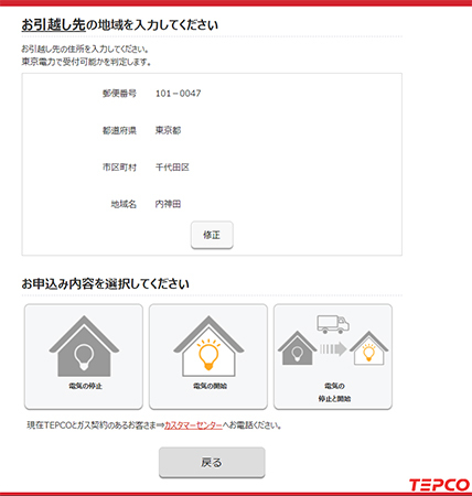 電気を停止する手続きは簡単だ。まず郵便番号から住所を表示させると、「電気の停止」のアイコンが表示されるので、それを選択する。アイコン表示はサイトのなかで随所に使われており、アイコンを選ぶと次の選択すべきアイコンが表示されてわかりやすい。