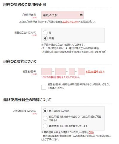 次のページに進み、現在の住所や契約名義、使用停止日、清算方法、停止日以降の郵送先などを入力したり、項目を選んだりする。氏名の漢字を入力すると、自動でカナ文字も記入されるなど、ユーザーフレンドリーな点もうれしい。