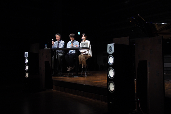 ヤマハのスピーカーNS-F901などを使った贅沢な構成で、ハイレゾ音源とトークを楽しんだ(左から、司会の北日本新聞社東京支社の梶尾徳行 営業部長、南壽あさ子さんのマネージャーを務める曼荼羅音楽出版の小竹克昌 代表、シンガーソングライターの南壽あさ子さん)