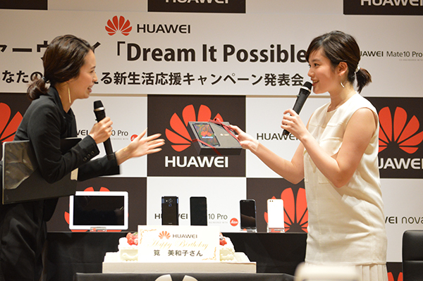 当日は、本人には秘密で誕生日ケーキと「HUAWEI Mate10 Pro」を贈るサプライズもあった。
