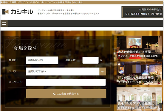 カシキルは、エリアや利用人数、幹事が準備時に手間取る会場の空き日程や付帯設備などを一発で検索が可能。オンタイムで会場の空き状況が確認できるほか、会場担当者の顔やアピールポイントも把握できる。スキマビ独自の選定基準によって、高品質な会場のなかから選ぶこともできる。店舗のこだわりやパーティ料理の特徴がわかるほか、コース料理の内容や金額もわかりやすく明示している。