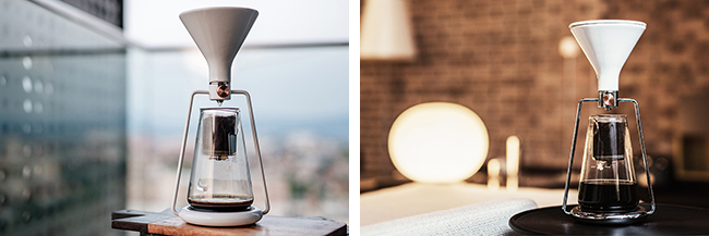 本体はミニマリスティックなデザインで、ドリップ速度調整バルブ、フタ付きセラミックファネル(じょうご)を備える。バッテリ駆動時間は約20時間。カラーは、ブラック、ホワイト、スチールの3色。