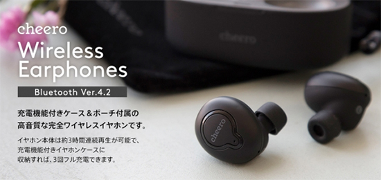 ティ・アール・エイの1事業部であるcheeroは3月8日、完全ワイヤレスイヤホン「cheero Wireless Earphones」の販売を8日正午に開始すると発表した。高音質で充電機能付きケースとポーチを付属。税込みの実勢価格は4680円だが、期間限定で特別価格で提供。Amazon直販で3980円(税込み)、楽天直販で4080円(同)、Yahoo直販で4080円(同)となる。