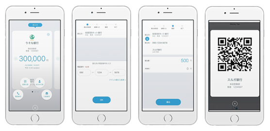 「Money Tap」の画面イメージ(左から、口座番号による決済、携帯電話番号を用いた送金、QRコードによる送金)