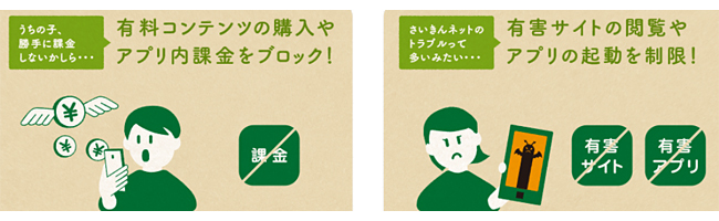 店頭で申し込むと、その場で店員が設定を行い、月々の携帯電話の料金とまとめて支払う「ソフトバンクまとめて支払い」が使えなくなるので、スマホゲームのアプリ内課金や有料コンテンツの購入をブロックできる。さらに、無料のフィルタリングサービス「あんしんフィルター」をあわせて申し込めば、子どもの年齢に合わせた強度でフィルタをかけ、有害サイトの閲覧やアプリの起動を制限できる。