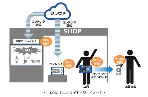 KDDI Touchサイネージは、来店者が静止画・動画を映像コンテンツとして繰り返し再生する「見る機能」に加えて、ディスプレイをタッチして自由にコンテンツを閲覧できる「さわる機能」、QRコードや専用アプリを利用して興味のあるコンテンツをスマートフォンやタブレット端末などにダウンロードできる「持ち帰る機能」の三つを備えている。店舗にとっては、通常の映像再生以外に商業施設でフロアマップや店舗情報を表示したり、店頭でタブレット端末などで映像再生をしておいて接客時に画面を切り替え商品の詳細情報を表示させたりなどの活用が可能。