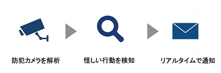 防犯カメラ映像を解析し、怪しい行動を検知すると、リアルタイムで通知する小売店舗支援ソリューション。万引きの未然防止に加え、万引き対策にかかる監視や見回りの人件費、防犯カメラ映像の巻き戻し探索業務の削減を図る。なお、リアルタイム通知は調整中で、試験版となる。
