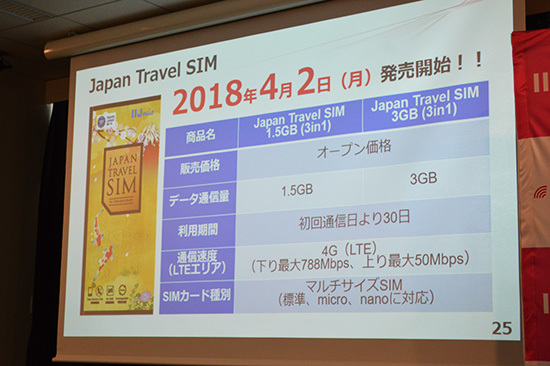 訪日外国人向けプリペイド型SIM「Japan Travel SIM」は4月2日に提供を開始。データ通信料は、1.5/3GBの2プランを用意。SIMカードは、標準/micro/nanoに対応するマルチサイズを採用している。