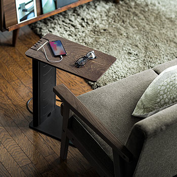 USB充電器を内部に収納することで充電用サイドテーブルとして使える。天板には、お部屋のインテリアになじみやすい落ち着いた風合いの天然木の「樺」を使用。iPadなどのタブレット端末や13インチ程度のノートPCが設置できる。充電器収納部は、機器を収納してもパネルで隠せるため、充電器が外からみえないスッキリとしたデザインとなっている。底面は四隅にフェルト付きの脚で床への傷を防止する。