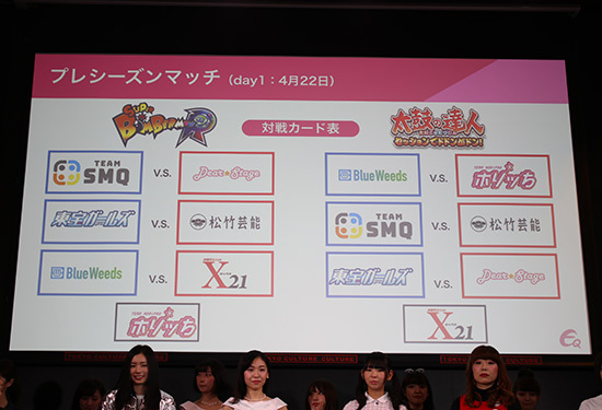 出場するのは、X21(オスカープロモーション)、teamSMQ(サンミュージックプロダクション)、DS☆ゲーム部(ディアステージ)、Shochiku Sisters(松竹芸能)、東宝ガールズ(東宝芸能)、BlueWeeds(blueskywalkers/N-weed)、ホリッち(ホリプロ)の7チーム。使用するタイトルは、Nintendo Switch用ソフト「スーパーボンバーマン R(KONAMI)」とPlayStation4用ソフト「太鼓の達人 セッションでドドンがドン!(バンダイナムコエンターテインメント)」だ。