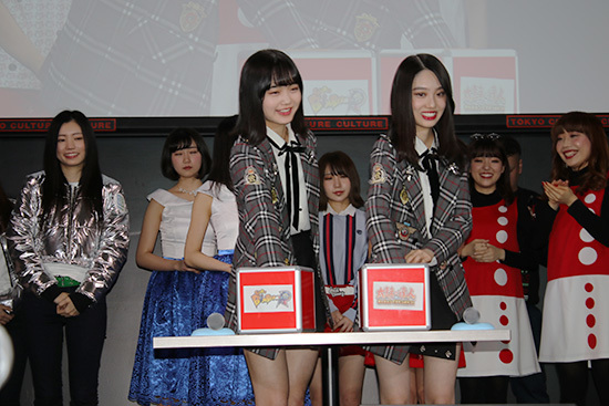 くじを引くX21(オスカープロモーション)の中里萌さん(左)と藤江萌さん