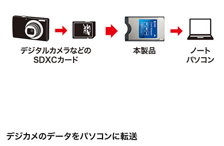 256GBまでのSDXCカードのほか、別途アダプタを用意すれば、64GBまでのmicroSDXCカードにも対応する。対応機種はPCカードTypeIIスロット搭載パソコン・携帯端末。