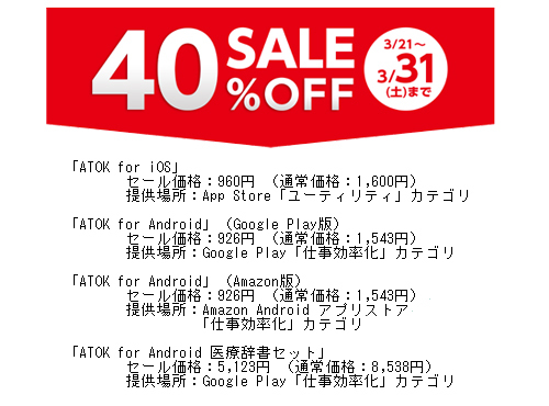 3月31日23時59分頃まで、11日間の期間限定特価。例えば、通常価格1600円の「ATOK for iOS」は960円となる。医療関係者向けの「ATOK for Android 医療辞書セット」も同様に40%割り引く。