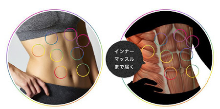 女性のしなやかなウエストづくりには、腹部表面の筋肉(腹直筋)だけでなく、側面の筋肉を刺激して鍛えることが必要とする。「3D Shaper」は長さ32cmの大判のマシンと8個のパッドが、ウエスト全体を包み込むと同時に、腹斜筋に3D刺激を加えることで多面的に筋肉に働きかける。