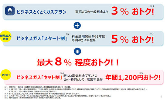 家庭向け都市ガス料金プラン「とくとくガスプラン」と同様に、東京ガスの「一般料金」から3%おトクな料金設定となっており、さらに契約から1年間限定のビジネスガス「スタート割」を含めると最大8%程度おトクになる。また、電気料金プランとのセット特典のビジネスガス「セット割」によって、電気料金も年間1200円、通常よりトクになるという。