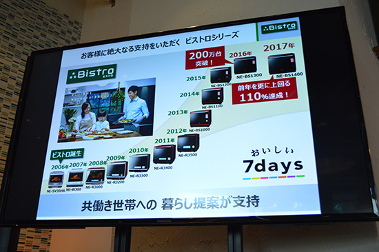 2006年にデビューした「3つ星 ビストロ」シリーズは毎年モデルチェンジを重ね、共働き世帯の暮らし提案で支持を拡大してきた。パナソニックの調べでは17年モデルは前年比で110%の販売台数を記録。冷蔵庫と合わせて展開している「おいしい7days」のコンセプトが評価されていることも販売増に大きく寄与しているようだ。