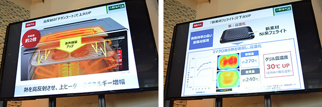 最新モデルの「NE-BS1500」は、メインターゲットである共働き世帯の最大の要望である“時短”をさらに追求した。新開発の「チタンコートグリル皿」は、上部では従来比2倍の高反射チタンコートでヒーターの赤外線量を増幅、下部では新素材のNi系フェライトが発熱効率を高めてグリル皿の温度を従来比で30℃上げる。また、マイクロ波をメニューに合わせて最適化することで加熱の効率化も図っている。