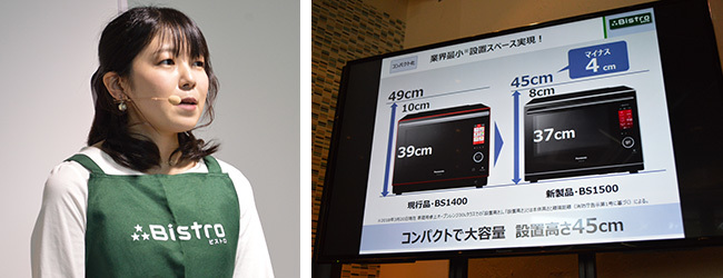 庫内容量30Lクラスでは業界最小の設置スペースを実現したのも特筆すべきポイントだ。高さは現行機「NE-BS1400」より4cm減の45cm。製品を担当するコンシューマーマーケティング ジャパン本部 スモールアプライアンス商品部 キッチン商品課の竹本幸美氏によると「レンジの収納場所は専用のレンジ台から食器棚のカップボードが主流になりつつある。その影響で設置スペースが狭くなり、大容量レンジ購入のハードルになっていた」そうだ。“45cm”はこれまで設置が困難だった多くの家庭でも許容できるサイズ感なのだという。