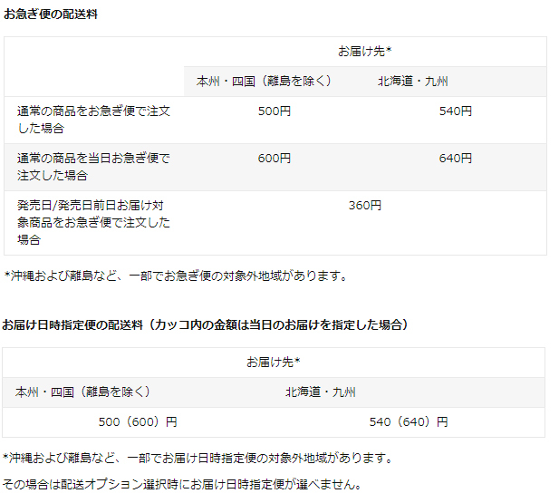 有料発送オプションの「お急ぎ便」は本州・四国(離島を除く)500円、北海道・九州・沖縄・離島540円に、「当日お急ぎ便」は本州・四国(離島を除く)600円、北海道・九州・沖縄・離島640円に、以前は離島など一部地域を除き、1件につき350円だった「お届け日時指定便」は500円からに値上げした。1回の注文で2か所以上に配送する場合は、配送先ごとに配送料がかかる。