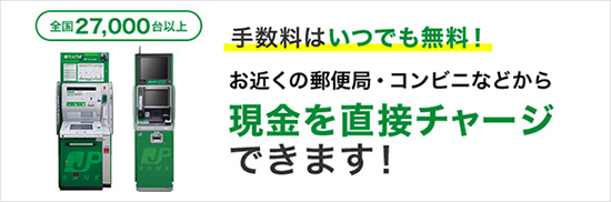 ソフトバンクカードをお持ちのユーザーは、全国にある約2万7900台のゆうちょATMでチャージできる。利用可能時間は午前0時05分から午後11時55分まで。チャージ手数料は無料。