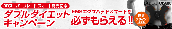 今回、発売を記念して「ダブルダイエットキャンペーン」を実施。「3DスーパーブレードS」「3Dスーパーブレードスマート」を購入したユーザー全員に4極のEMSエクサパッドスマート(非売品)をプレゼントする。