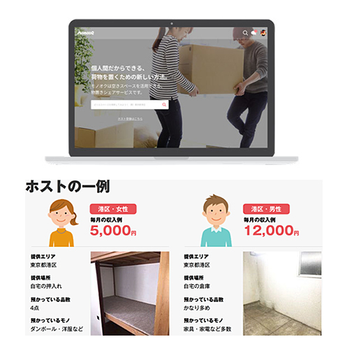 「モノオク」は、個人が使っていない部屋や押入れなどをトランクルームのように提供し、他の個人(ユーザー)がその空きスペースを使って手軽にモノを片付けられるサービス。利用料金は1か月あたり7000円が目安。荷物の量や大きさ、そのほか付加サービスによって、スペースを提供して荷物を預かるホストが金額を設定する。
