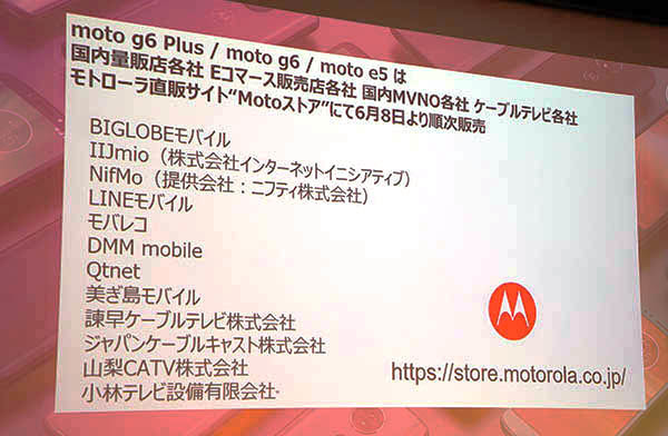 モトローラ・モビリティ・ジャパンは6月7日、都内で発表会を開き、2018年4月に海外で発表されたSIMフリースマートフォン(スマホ)「moto g6 plus」「moto g6」「moto e5」の販売を6月8日に開始すると発表した。各モデルとも、国内すべての通信キャリアに対応し、顔認証ロック解除機能や背面指紋認証を搭載している。販売チャネルは、家電量販店やMVNO各社のほか、ケーブルテレビ各社なども対象となる。