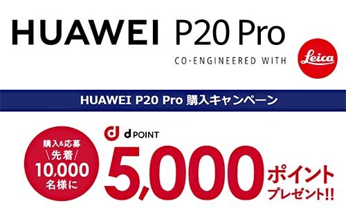 ファーウェイ・ジャパンの主催で、店頭またはドコモオンラインショップで「HUAWEI P20 Pro HW-01K」を購入し、専用サイトから応募した先着1万名に、dポイント5000ポイントをプレゼントする「HUAWEI P20 Pro 購入キャンペーン」を8月31日まで実施している。応募期間は9月10日まで。