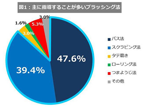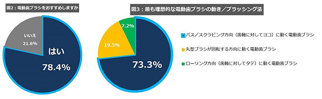 また、回答した歯科医師の78.4%が患者などに対して、電動歯ブラシの使用をすすめており、もっとも理想的な電動歯ブラシの動き/ブラッシング法としては、73.3%が手動での歯磨きと同様に「バス/スクラビング方向(歯軸に対して横方向)」が理想的と回答した。