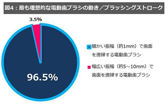さらに、電動歯ブラシのふり幅としては、96.5%が「細かいふり幅(約1mm)で歯面を擦掃する電動歯ブラシ」がもっとも理想的な動きと回答した。