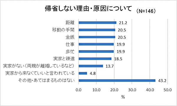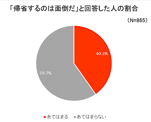 同社が20~40代の男女を対象に実施した「帰省に関する調査」で、帰省をしない理由として最も多くあげられたのは、「実家までの距離」が遠いからだった。2位は「移動の手間」「金銭」、3位は「仕事」「多忙」となった。さらに、全体の4割は帰省が「面倒」と感じており、半数以上の女性は「夫の実家に行きたくない」と感じていることがわかった。