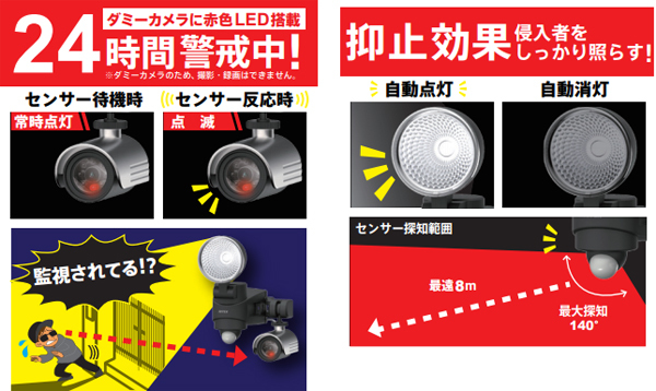 ダミーカメラと長寿命のLEDセンサーライトを一体化しているため簡単に設置でき、電源ケーブルを接続するだけで使用できる。ダミーカメラには、常時点灯する赤色LEDを装備。探知センサーが侵入者を検知すると、500ルーメンの明るさで照らす。