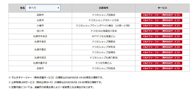 NTTドコモは、北海道のドコモショップでマルチチャージャーによる無料充電サービスを実施している。ドコモユーザーに限らず、誰でもスマートフォンやケータイ電話の充電を利用できる。設置場所は以下の通り。