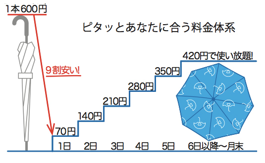 盗難防止機能付きの特殊傘にIoTを組み合わせ、駅近くの店舗やオフィスビルの遊休スペースにあるシェアスポットに置いた傘をどこでもレンタルでき、好きな場所で返せる仕組みを実現した。突発的な雨でもビニール傘などをわざわざ購入する必要がなくなり、雨がやんだら使わなくなった傘を最寄りのシェアスポットに返却して手荷物を減らせる。