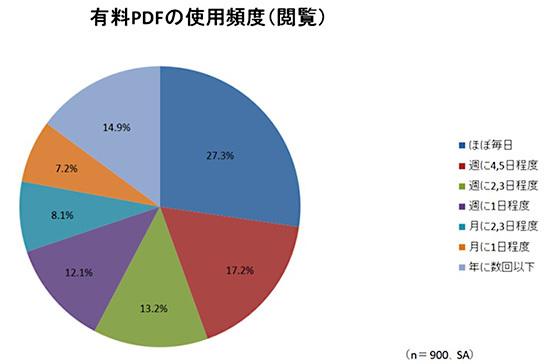 調査では、ジャストシステムの「JUST PDF」、ソースネクストの「いきなりPDF」、そしてアドビシステムズの「Adobe Acrobat」を使っている、それぞれの300人、計900人にアンケートを実施した。まず、有料PDFソフトで閲覧する使用頻度について聞いたところ、「ほぼ毎日」と答えたのが27.2%で最も多く、次いで「週に4~5日程度」が17.2%、「週に2~3日程度」が13.2%、「週に1日程度」が12.1%と続く。7割近くのユーザーが、最低でも1週間に1回はPDFファイルを目にしているということだ。