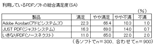 そのユーザーそれぞれに使用しているPDFソフトの総合満足度を聞いた。すると、「満足」と答えたのが、他社製品で10%台だったのに対し、Adobe Acrobatでは20%を超えた。しかも、「やや満足」を含めると90%近くにまで達した。